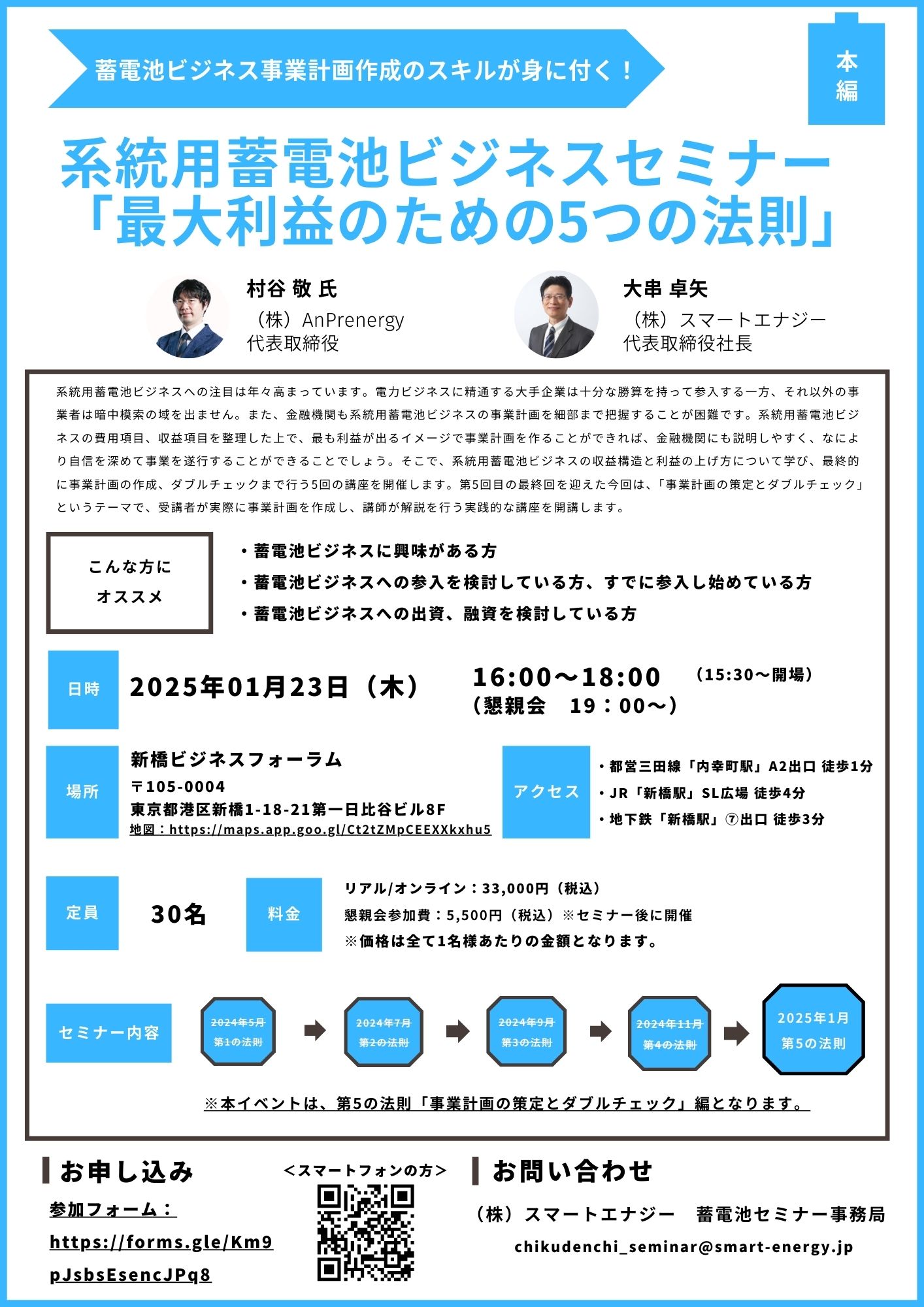 2025年1月23日(木)に弊社と株式会社AnPrenergyの共催で実施する『系統用蓄電池ビジネスセミナー「最大利益のための5つの法則」』本編・第5回を開催します。